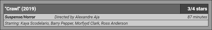 To that end, the central performances are dialed in and gut level, the effects just south of slick but never a distraction. Scoledario may well have impressed in her recurring role in The Maze Runner series, though I wouldn’t know, but based on her relatability and non-histrionic command here, she has a future as a dependable, above-line horror heroine if she wants it. I have a bad feeling about her house’s realistic chances for resale, though. Aja’s restless camera, which never glides above the fray but, rather, hunkers down and makes itself comfortable in the steadily increasing murk, does a great job of constantly implying amphibious activity where there may not, in fact, be any, or where there might actually be rather more than we expect. He provides effective close quarters action and horror both creeping and immediate throughout, but there is never any doubt which end of the spectrum he favors. Crawl is not all-time amazing horror or anything, but it sets a mighty high bar for the next “alligators hunt humans in a hurricane” movie that comes down the pike. With the gators’ underwater speed, killing acumen, and inherent savagery giving them a significant home-swamp advantage, Crawl envisions the trapped humans almost as if they’d traded places with the doomed dinner lobsters in the foyer tank of a fancy seafood restaurant, and the liberated main course morsels were outside instead, peering in with beady eyes and claws unbound and licking their figurative chops. If that sounds like fun to you, then, brother, will it ever be. And, if not, hey, Disney remade The Lion King with talking, singing photo-realistic CGI animals! I’m sure that’s possibly worth seeing too.