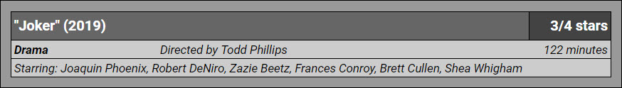 Any detectable evidence to the contrary, I promise you I’m not here to mince words. So, is Joker worth seeing? Absolutely, assuming you can stomach it – I’ve noticed a typed disclaimer taped to the box office window of my local AMC theater warning potential, presumably young, patrons and their perhaps overly permissive guardians that this isn’t a “typical” superhero movie of the sort they’ve no doubt become conditioned to in recent years – but only, and I mean only, because of Joaquin Phoenix’s performance as Arthur Fleck. Nothing else matters here, because, honestly, nothing else really exists. As a surprisingly palatable, even objectively strong example of the outlier niche genre “Villain Origin Story”, I could damn Joker with the faint praise that comes along with sitting atop a heap that also contains the Star Wars prequel trilogy, Rob Zombie’s Halloween, and Hannibal Rising, but I think it’s more of a natural piece with recent tour-de-force acting exhibitions that overwhelmed their surrounding films, like Daniel Day-Lewis in Lincoln, or Gary Oldman in Darkest Hour. Similarly, it seems almost a foregone conclusion at this point that Phoenix will take home his first Academy Award in four attempts playing the same role for which Heath Ledger won posthumously, and with good reason. He’s a negative space in human form that radiates even when standing still, almost like a hole visibly burning through the film stock. I wish the story was more worthy of him. There’s nothing the least bit glamorous about Joker’s rise here, which seems as much happenstance as serendipity in the final analysis, but Arthur will certainly take it. I buy him as a tragedy, because of Phoenix, and I buy him as a cautionary tale. Much more than I buy him as a villain. Perhaps that’s a job for the sequel.
