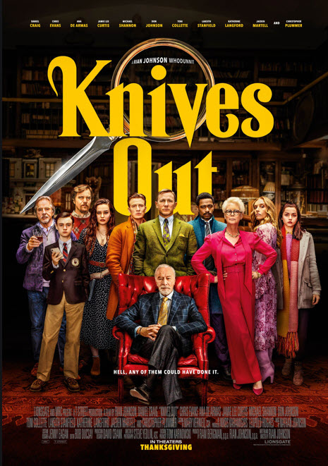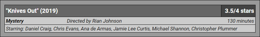 Movie review etiquette strongly advises I not reveal the killer whose identity lies at the heart of Knives Out, Rian Johnson’s delightful update for impatient, attention-addled contemporary audiences of the time-worn but still effective Agatha Christie “locked room” style of mystery. This is far easier said than done, since, in a fairly stunning twist that proves to be only the first of many the film will lob at us like a loaded ball machine ready for tennis practice, the culprit is actually identified around the halfway mark, yet the stately country manor house remains so conspicuously full of colorful, highly motivated suspects otherwise. Who among this snooty, sniping, self-interested rabble honestly couldn’t be a potential villain, and might they yet eventually still seize their moment, even with matters ostensibly settled? There is always the gnawing feeling with Knives Out that something else, something more, is at play here, that we don’t and, indeed, can’t possibly have all the clues yet, to say nothing of connecting them. This notion, which afflicts the viewer early, often, and, occasionally to the point of absurdity, is also always correct, right up to the moment the end credits roll and all involved can finally exhale. Also in near-perpetual question are the basic facts of the affair, and, at times, even the nature of the “crime” itself. Johnson takes palpable pleasure in continually complicating matters at the crowded estate in clever, if not insidious, ways, but also, by and large, seems to play fair with both his spectacular cast and his complicit audience, rewarding the rapt attention of the latter with the savory fates of the former. The trap that ends up ensnaring one and all is engaged and executed with acceptable, almost impenetrable logic and clockwork precision.