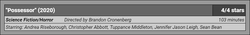 The questions pile up, and continue to well after the worm inevitably turns (then turns again). This story would be served just as well and perhaps even better as part two of a four-hour miniseries, or part three of a six. It’s that deep and that consistently interesting. The brilliance of Possessor is that it actively invites the questions I’ve already posed, plus numerous others I’ll withhold, before immediately rendering them irrelevant in the service of something bigger and more shocking, consigning them instead to swim around in your own headspace. This is a movie that stays with you. I can speak to the quality of its direction – which in its angular craftsmanship and phantasmagorical edge echoes Cronenberg’s immortal father, David (The Fly, Scanners, Dead Ringers, The Brood) – and script – also by the younger Cronenberg, and, for my money, as provocative as anything his father ever created while also more elegant – as well as the central performances by not just Riseborough but Christopher Abbott, whose turn as the possessed Colin Tate never strains credibility and eventually sends the movie into a whole new dimension of impact and heartbreak. Not unlike the elder Cronenberg’s Videodrome, Possessor isn’t a straight horror film so much as a dystopian psychodrama that occasionally horrifies, though, when called upon, it goes for the jugular and just keeps tearing. Lest you worry I might have given away too much of the movie with my scene-setting introductory graphs and other assorted plot points, please rest assured I have revealed just enough and no more. I consider it a sacred trust to steer towards Possessor as many interested parties as I can, or at least those who, ahem, possess the curiosity, love of pure cinema, and cast-iron stomach it requires.